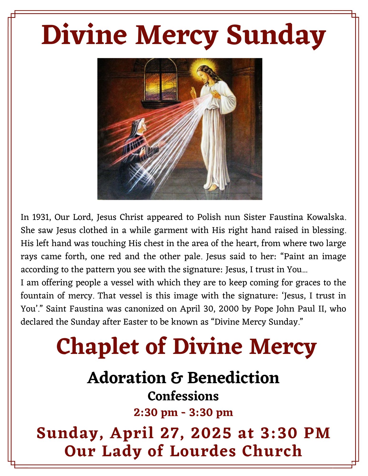 Join us on Sunday, April 27, 2025, at 3:30 PM at Our Lady of Lourdes Church as we come together to celebrate Divine Mercy Sunday. This beautiful feast was established after Jesus appeared to Saint Faustina Kowalska in 1931, asking for devotion to His Divine Mercy. He instructed her to have an image painted with the words, "Jesus, I trust in You," to remind us of the endless mercy flowing from His Sacred Heart.
